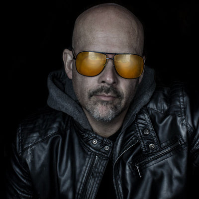 man in leather jacket wearing hd driving sunglasses