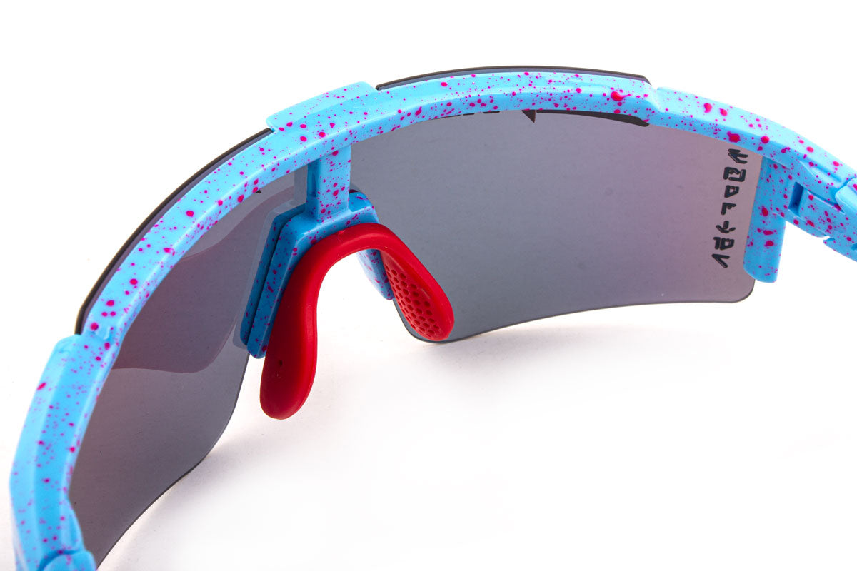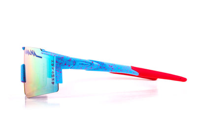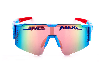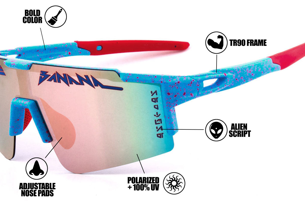 The frames are in blue with red specks and the multicolor Space Banana logo. A secret alien language imprinted on the lenses, these are more than just facial awesomeness, they are a conversation piece. Get ready to hear "Sick shadessssss!!!" a lot!