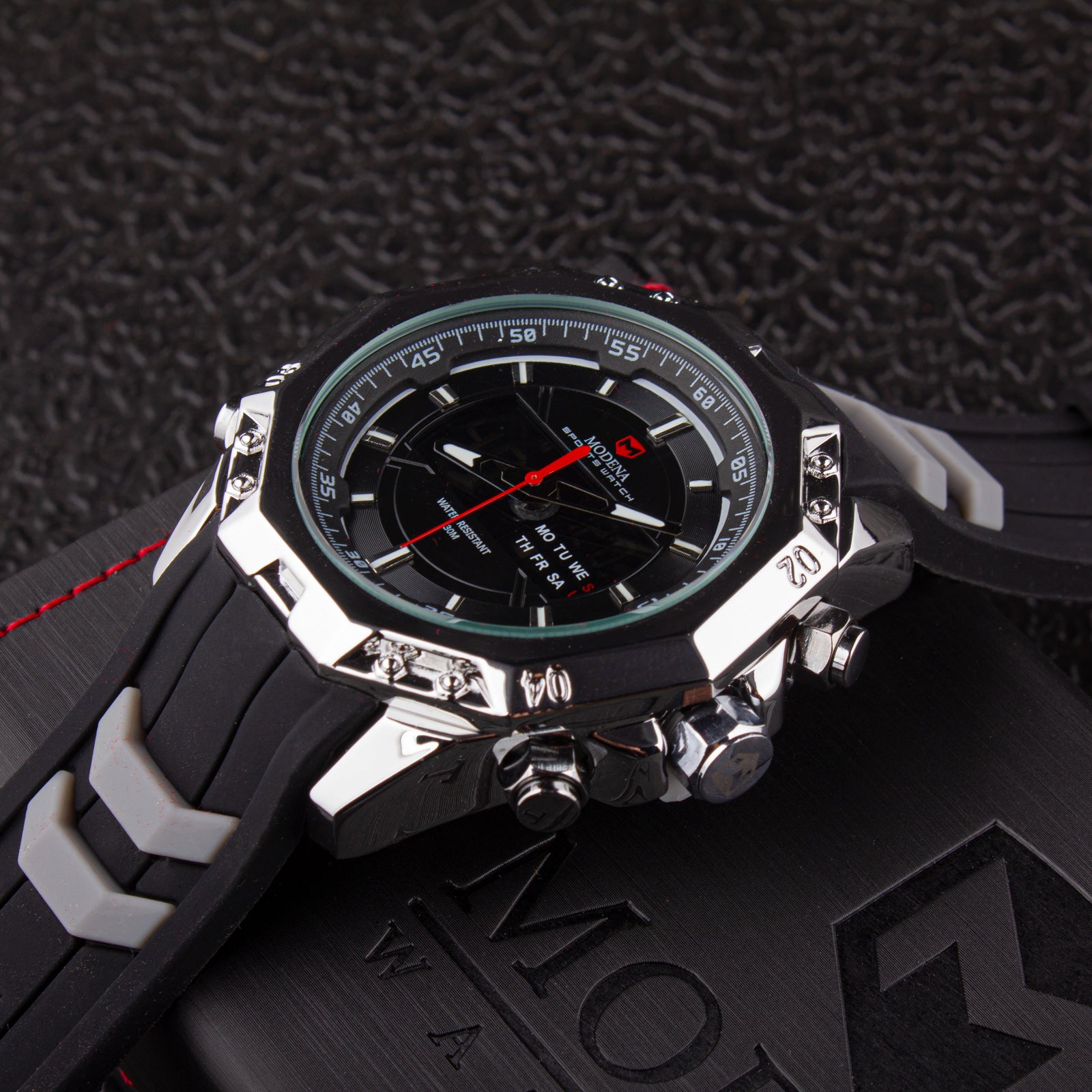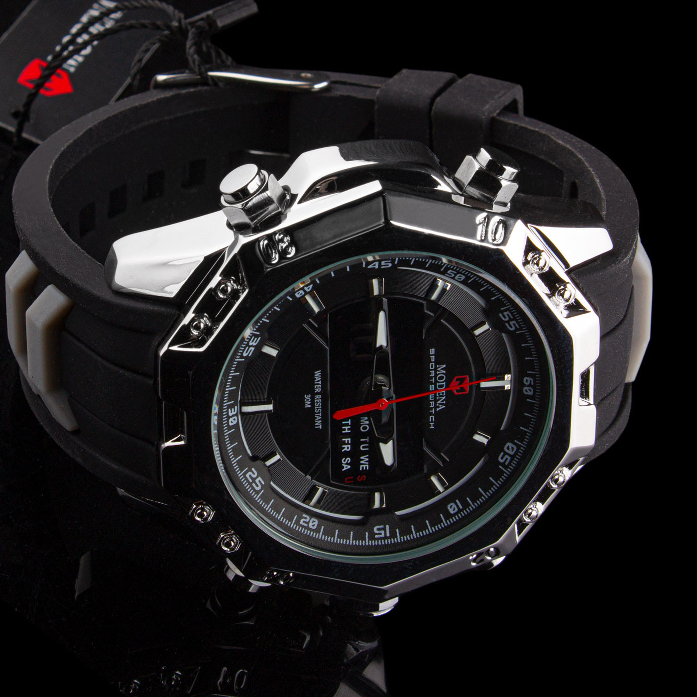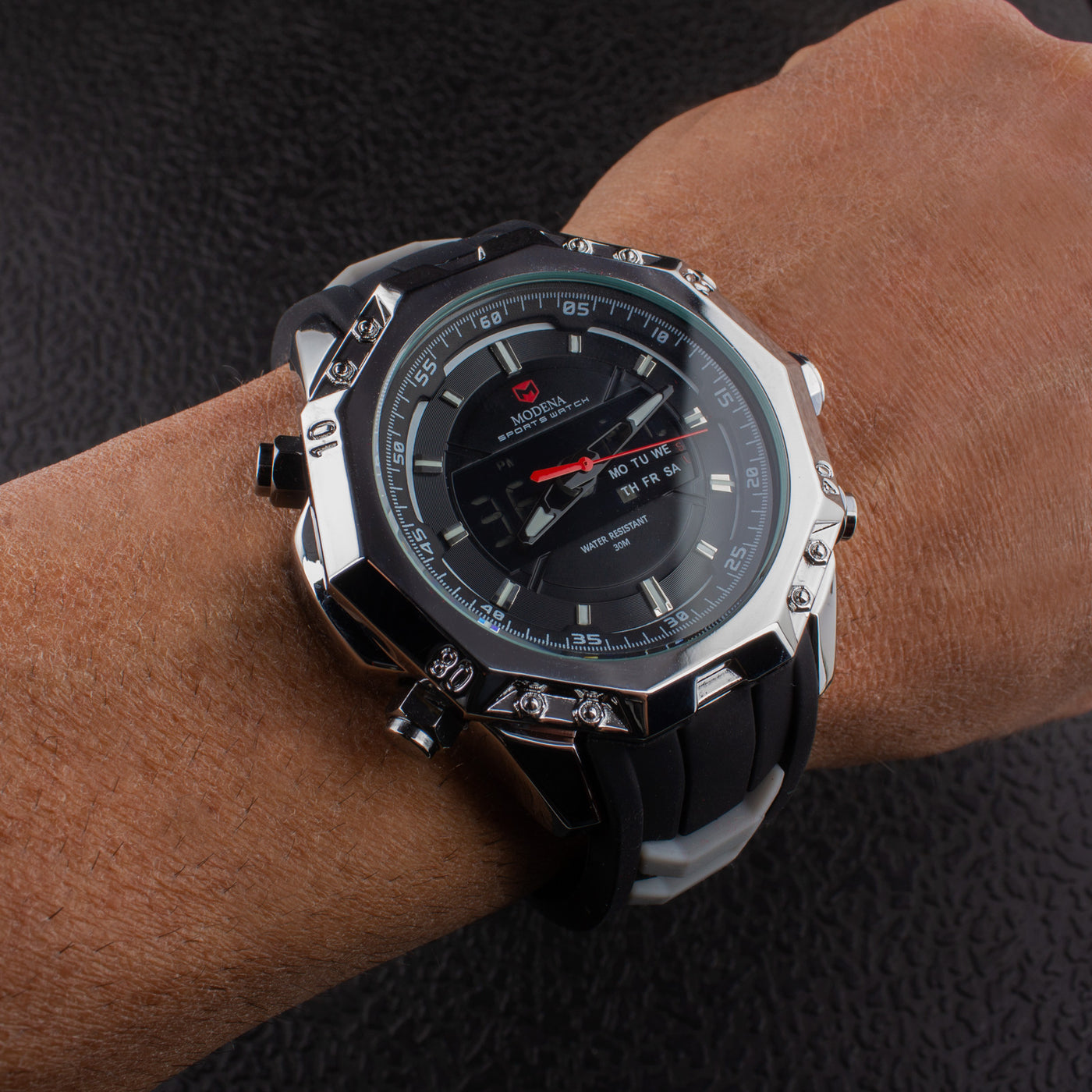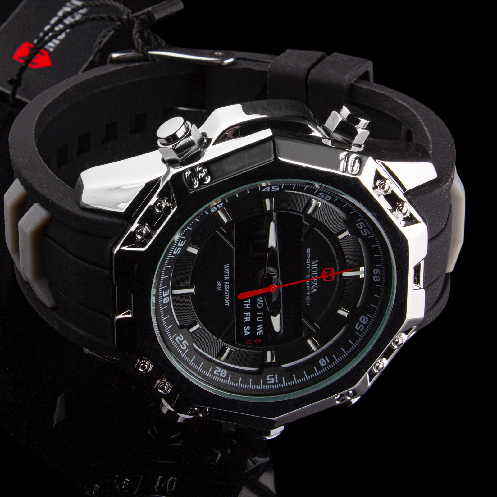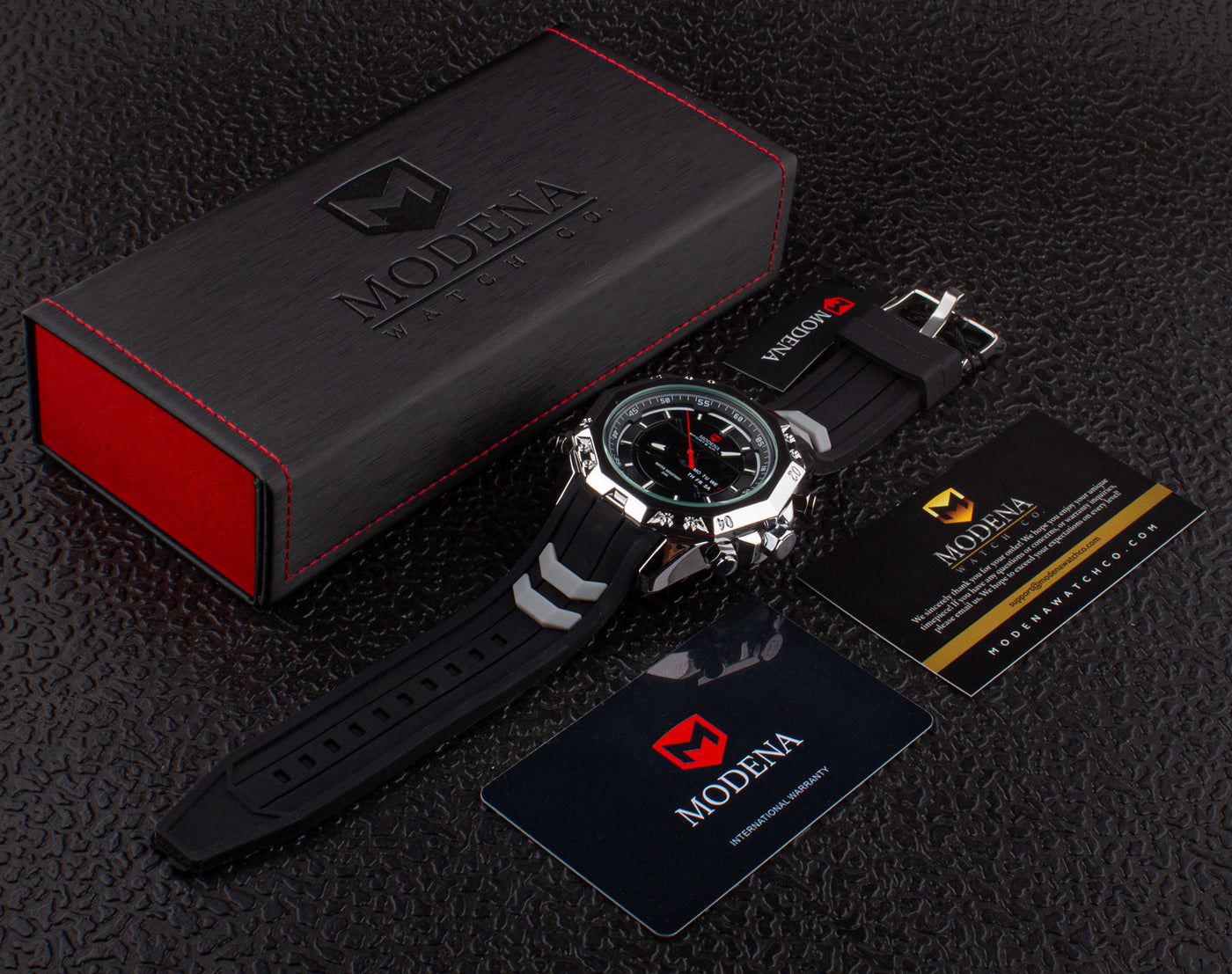 The SPYDER sport watch from the Modena exotic collection is inspired by the colors, materials and build quality of fine Italian sports cars. This incredible timepiece features both analog and digital timekeeping, as well as a backlit LCD display, stopwatch, alarm, and more.