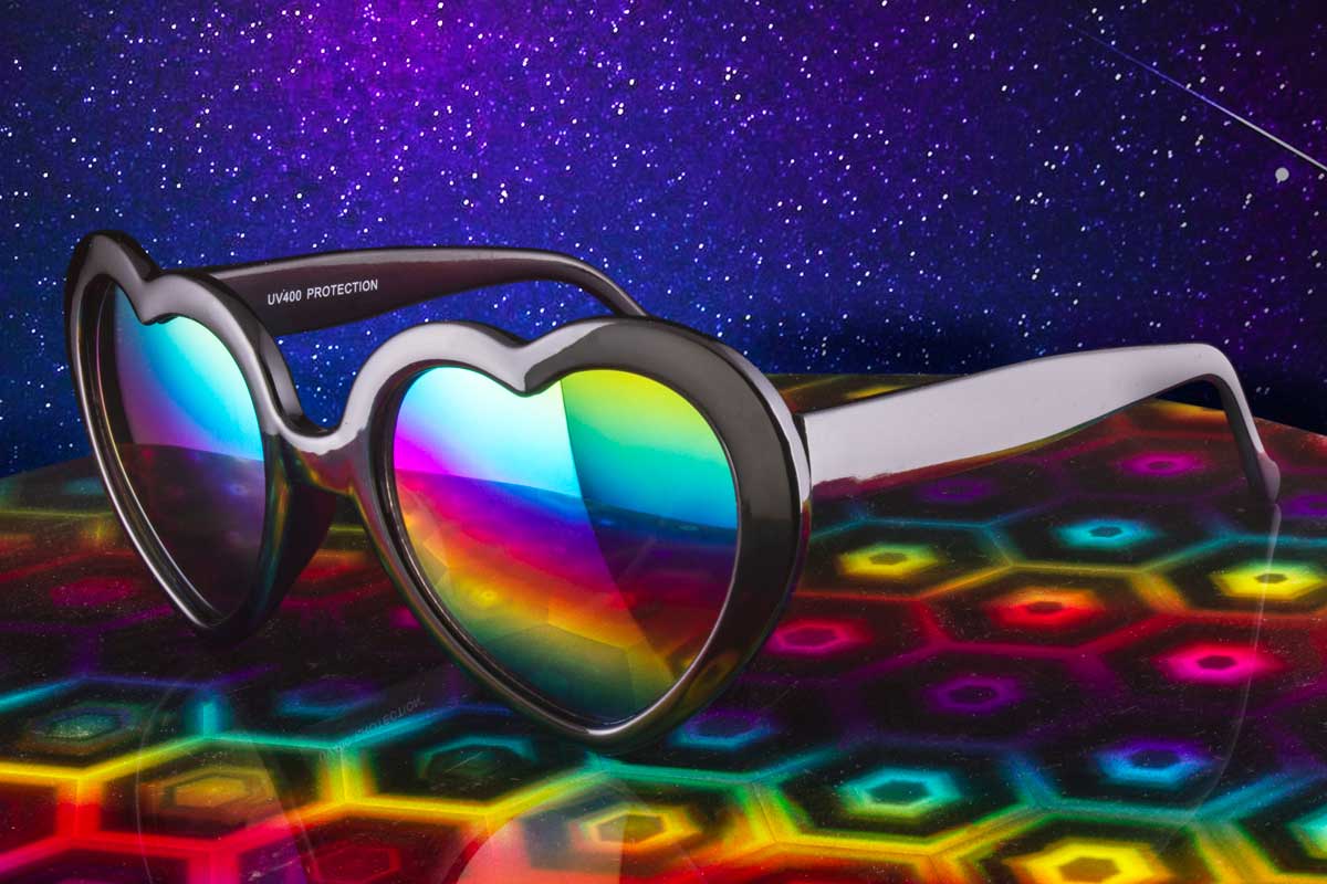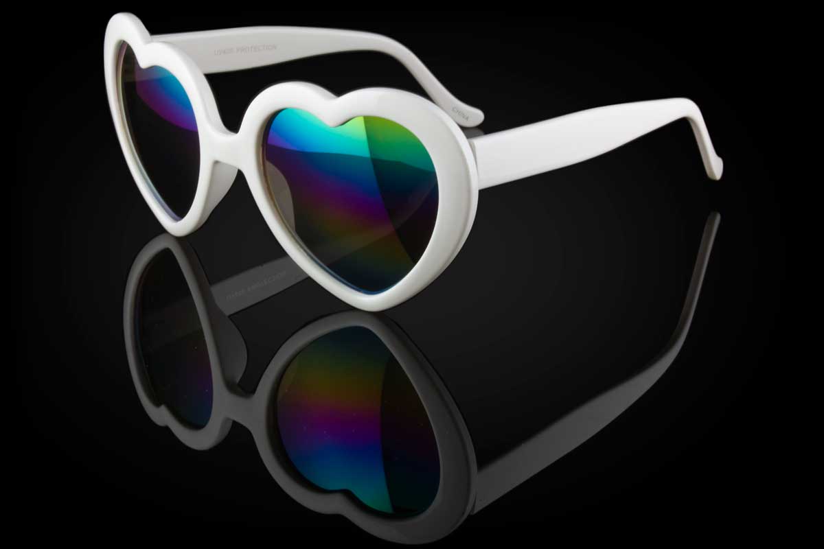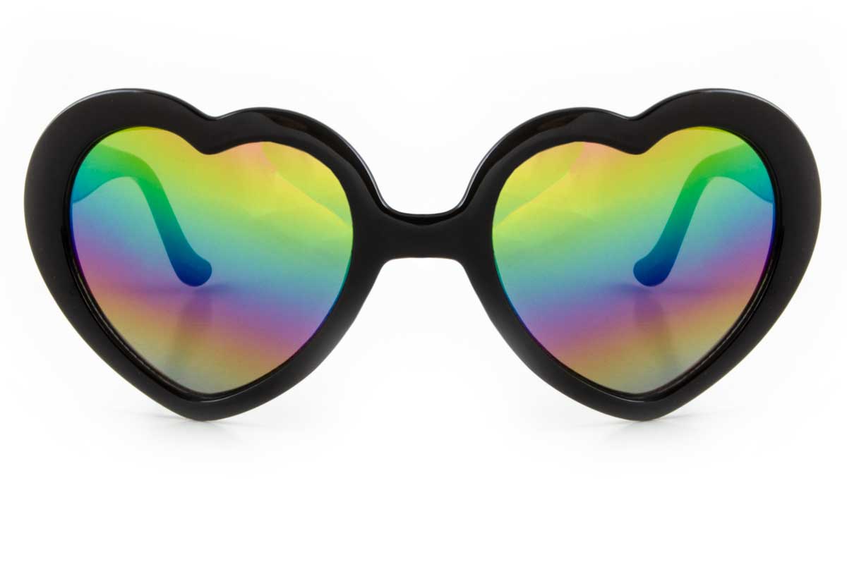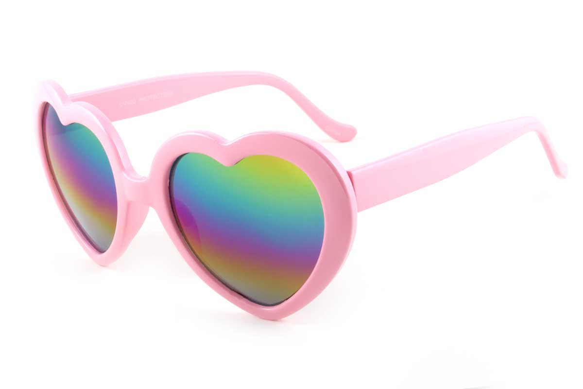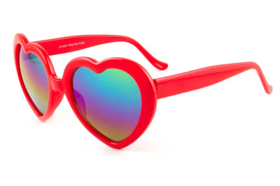 The CUPID shades feature heart shaped framed and multi colored lenses that offer 100% UV protection. They are made of a strong plastic frame and offer a medium tint.