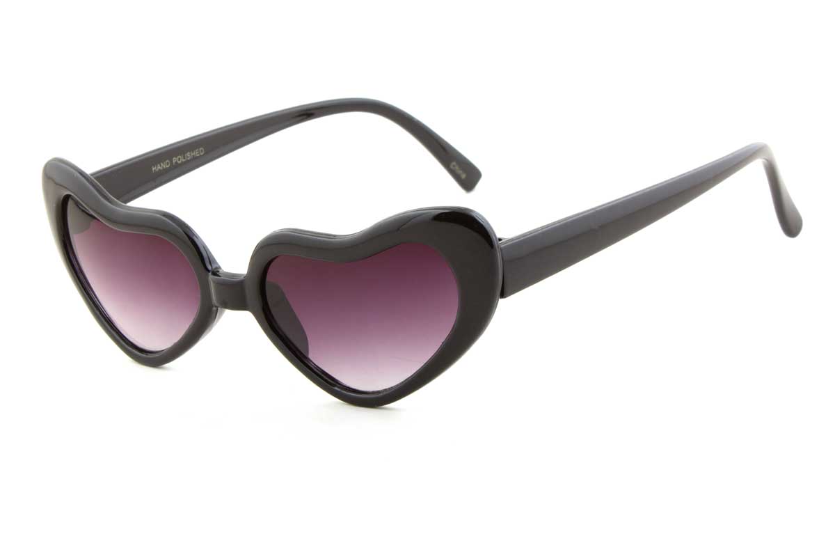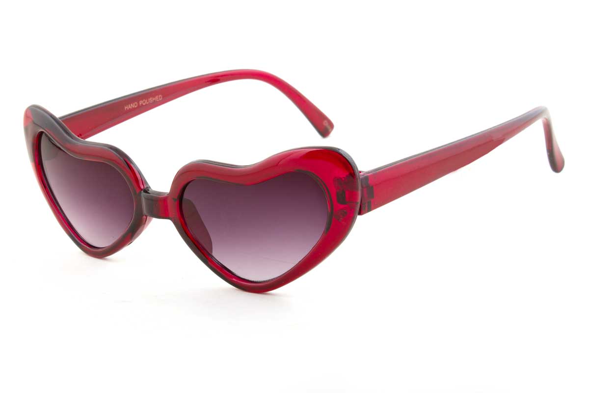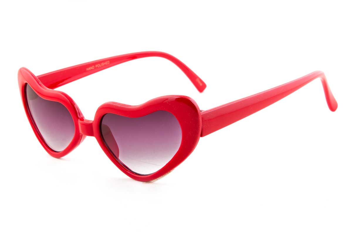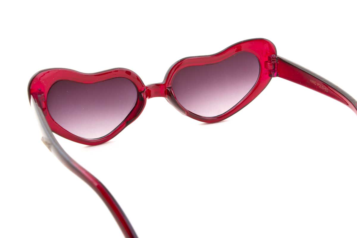 The LOVEBIRDS sunglasses feature heart shaped lenses that tilt upwards with a cateye appearance. They offer 100% UV protection.